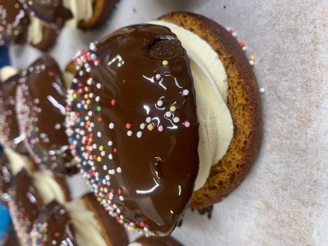 Vores honningbombe er med abrikos marmelade og vanilje smørcreme.